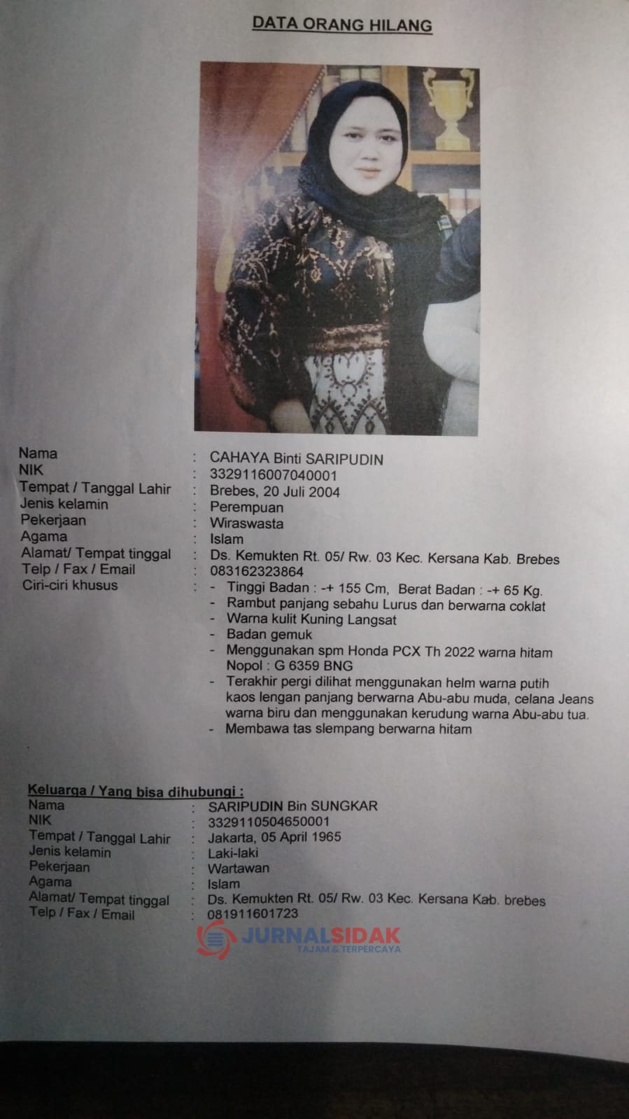 Brebes // jurnalsidak.com  //seorang anak perempuan dari adalah Desa Kemukten RT 05/03 Kecamatan Kersana Kabupaten Brebes. Cahaya Binti Saripudin, seorang wanita berusia 21 tahun, telah meninggalkan rumah sejak 4 hari yang lalu dan belum kembali. Orang tua Cahaya, Saripudin bin Sungkar menyampaikan, kekhawatirananya dan meminta bantuan masyarakat untuk membantu mencari putrinya.
