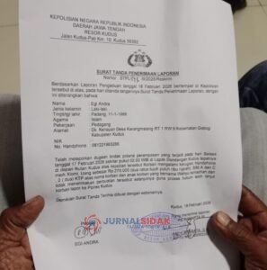 Berdasarkan Surat Tanda Penerimaan Laporan tertanggal 18 Februari 2026, korban Egi Andra (58) warga Desa Karangmalang, Kecamatan Gebog, Kabupaten Kudus, resmi melaporkan kejadian itu ke Polres Kudus.