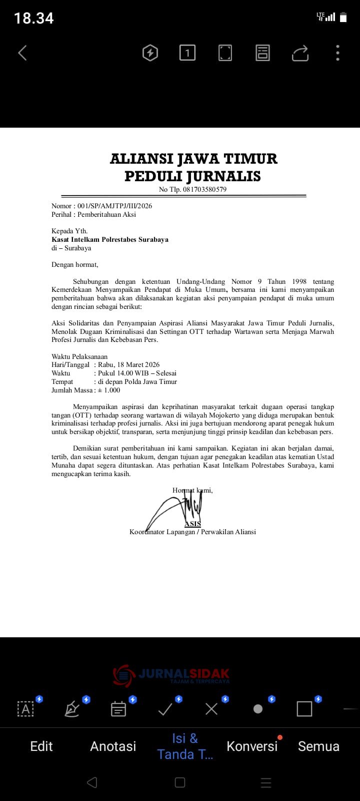 SURABAYA – jurnalsidak.com Sekitar 1.000 massa yang tergabung dalam Aliansi Jawa Timur Peduli Jurnalis dijadwalkan menggelar aksi unjuk rasa di depan , Rabu (18/3/2026) siang. Aksi ini merupakan bentuk protes atas dugaan kriminalisasi terhadap seorang wartawan dalam kasus operasi tangkap tangan (OTT) di Mojokerto.